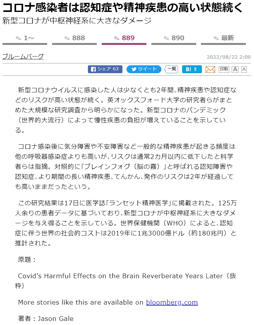 確かにオミクロン株は重症化率は従来株よりも低いのですが、新型コロナの後遺症(脳障害)である頭がぼーっとするブレインフォグは高頻度(24%)で認められているようです。ワクチンの副反応よりも新型コロナの後遺症の方がはるかに頻度が高いので、ブースター接種を受けるメリットは大きいと思います